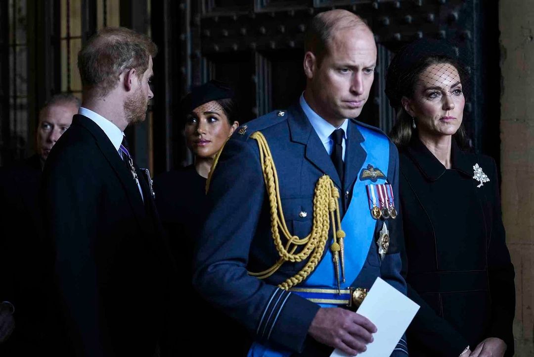 Britain's Prince William, second right, Kate, Princess of Wales, right, Prince Harry, left, and Meghan, Duchess of Sussex, second left, leave after they paid their respects to Queen Elizabeth II lying in state at Westminster Hall, in London. #APPhoto Emilio Morenatti @emilio_morenatti
