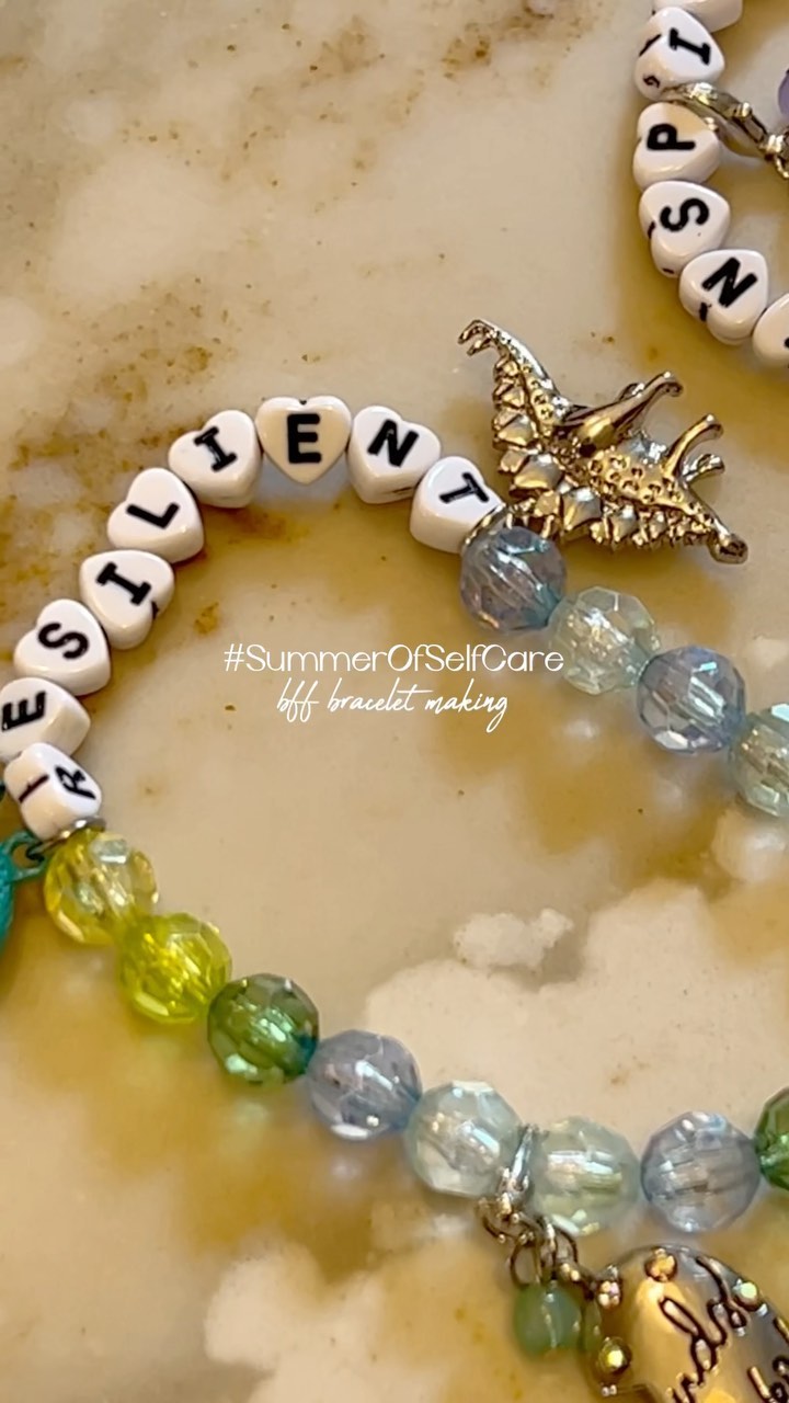 We made each other friendships bracelets with a special word for the other person 🥹🫶🏼 @racheldacosta_ wrote ‘resilient’ for @lifewithahallucination and Mary wrote ‘inspiring’ for Rachel! What word would you want your bff to choose for you? ✨✨✨ #summerofselfcare