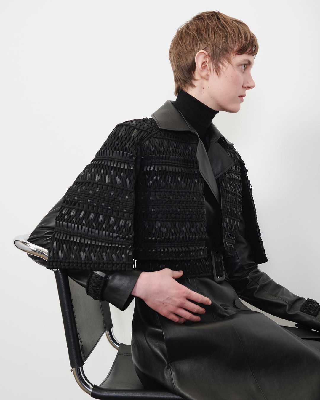 Double-breasted trench Sola coat with leather and silk crepe de chine woven armour detail #ghfw22