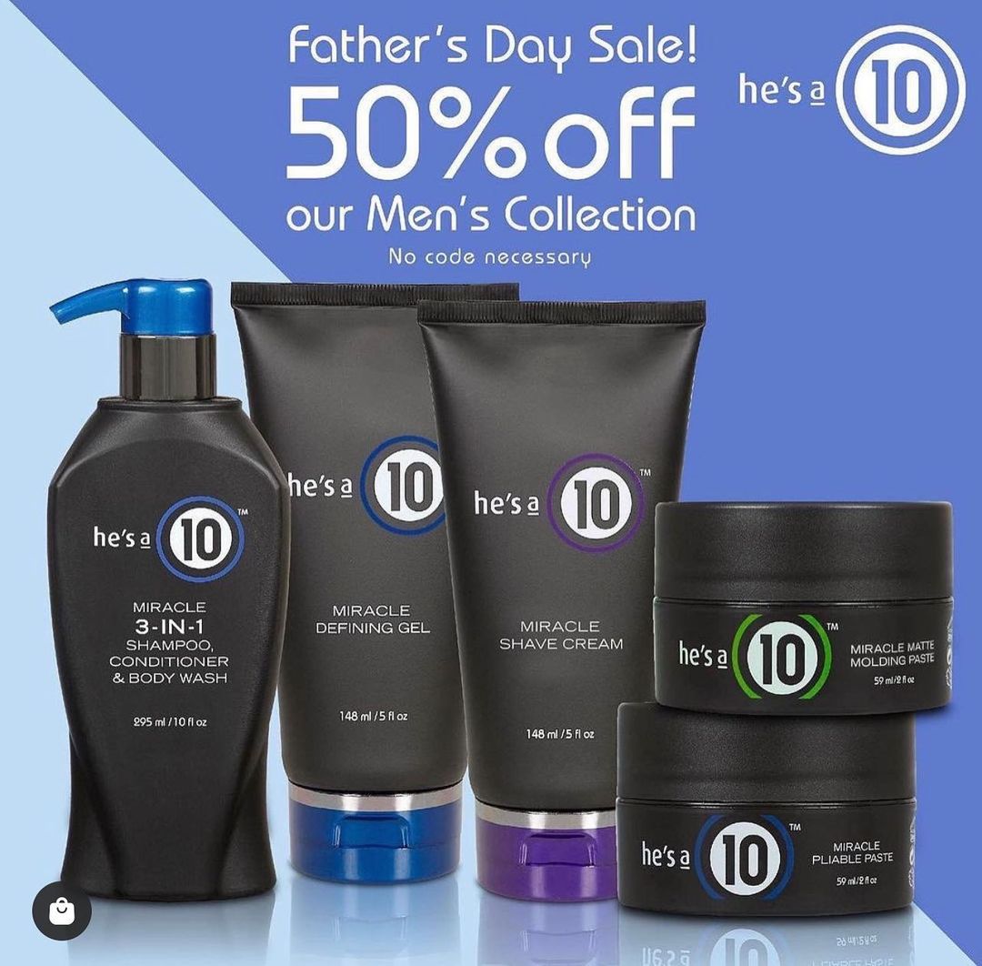 Today we celebrate Fathers with 50% off our entire He’s a 10 collection! Mens 3 in 1 ~ shampoo, conditioner and body wash, Pliable Paste styler, Matt Molding paste styler, Hair gel and shaving cream... all 50% off🎉