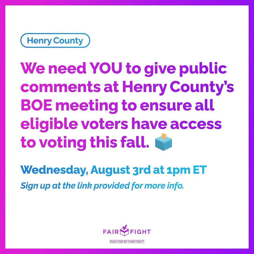 HENRY COUNTY VOTERS: Can we count on you to give public comments at your county’s Board of Elections Meeting TOMORROW at 1pm ET to ensure all eligible voters have access to voting this fall?