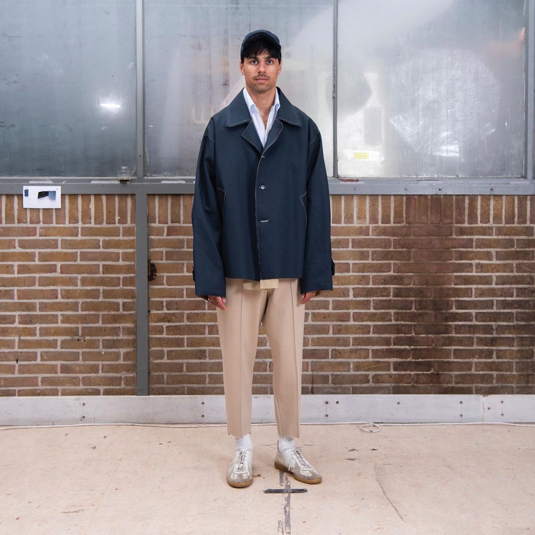 SS22 Oversized short mackintosh In navy/sand