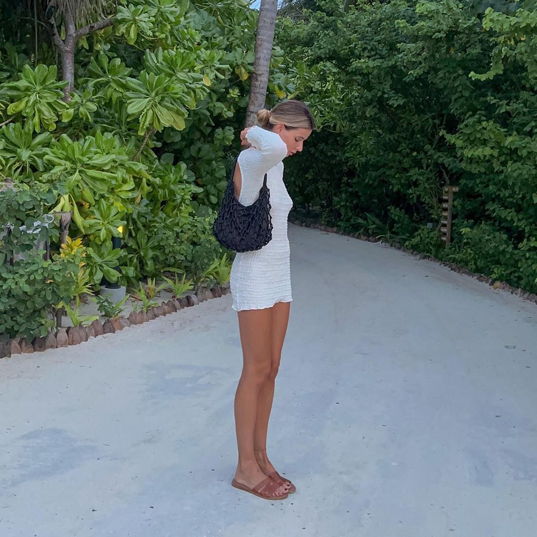 Estilazo de @laurabrunet en sus vacaciones por las islas Maldivas 🏝️ Combina su vestido de espalda al aire y bolso crochet negro con nuestras sandalias coco 🤎⭐️