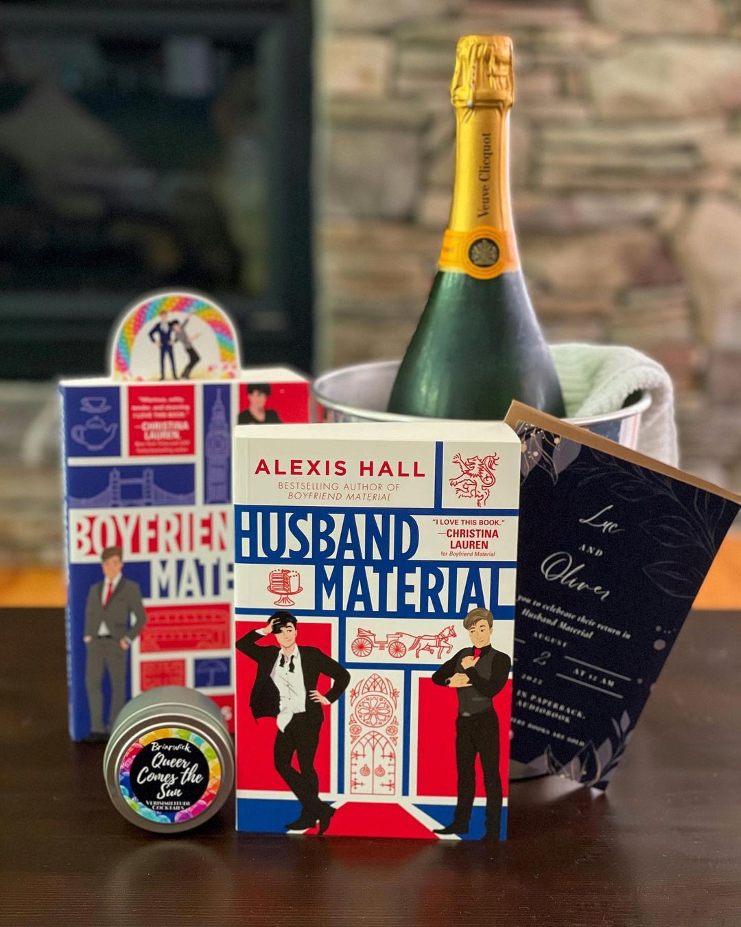 [Picture ID - Husband Material with an invitation, candle, Boyfriend Material, bottle of champagne, and fireplace in the background.]