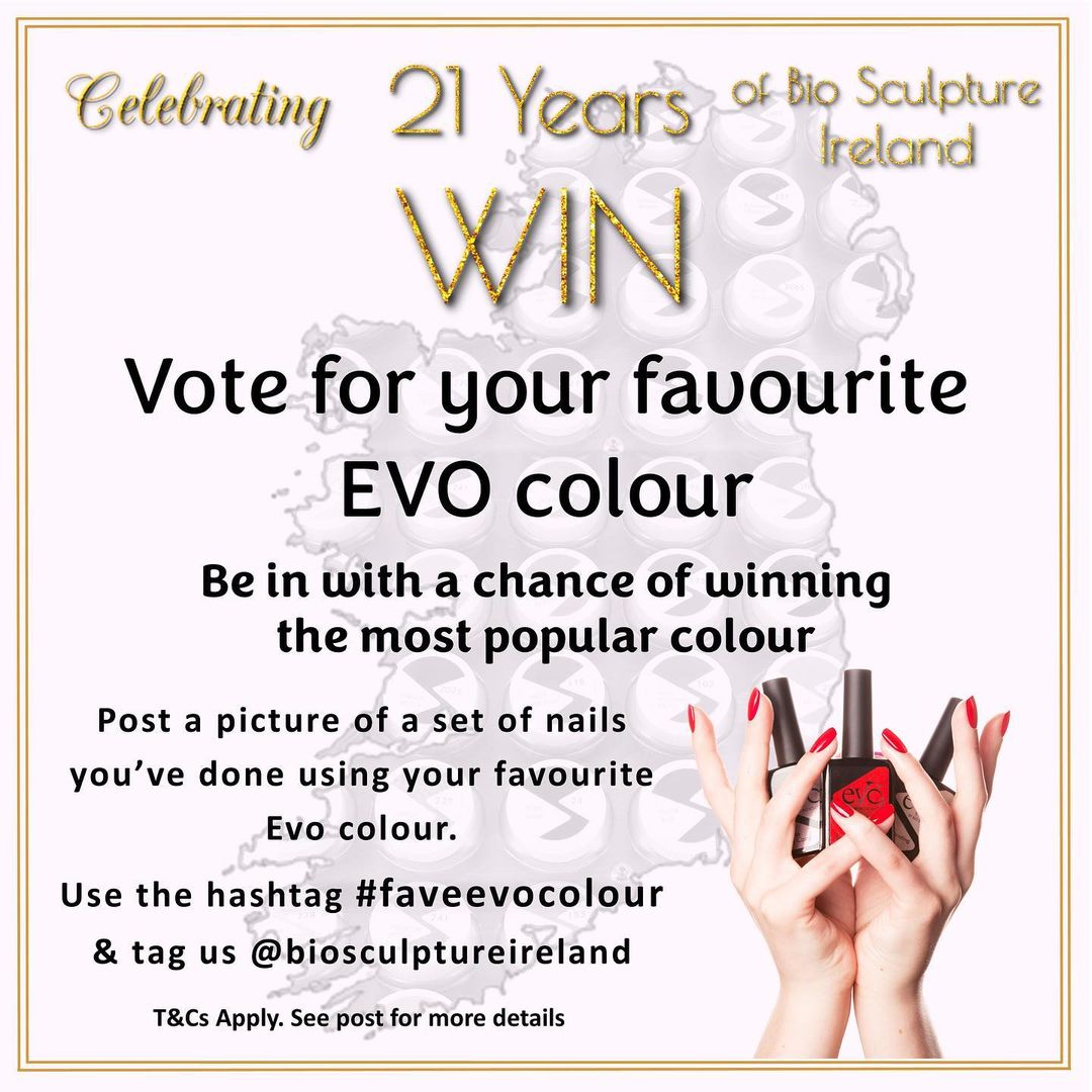 To continue celebrating 21 Years of Bio Sculpture Ireland, we are giving away the most popular Evo colour, as voted for by you, to 3 lucky Bio Sculpture Technicians.