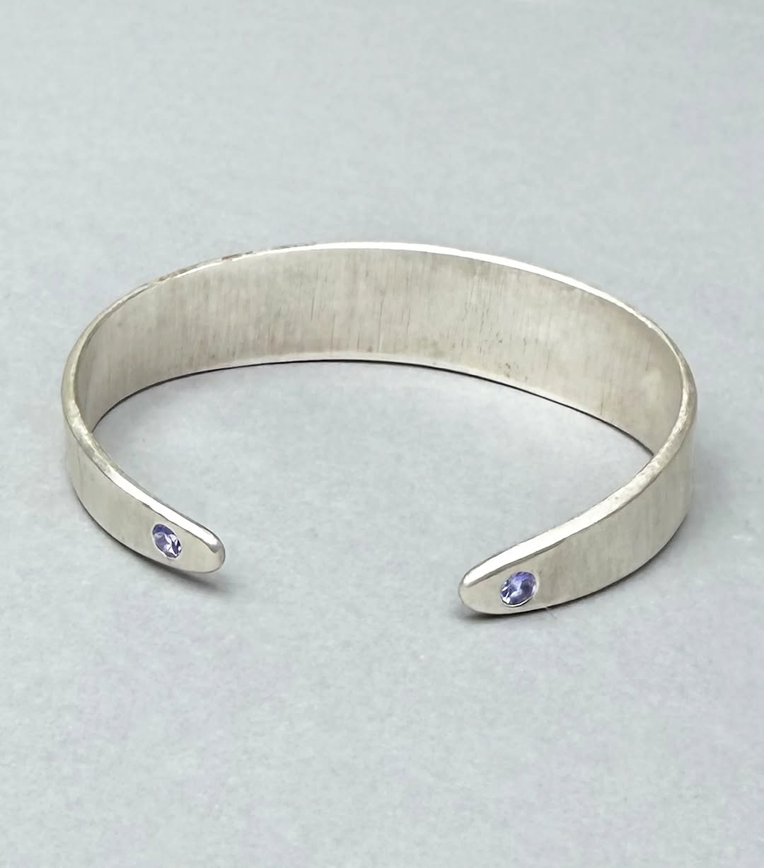 Tanzanite silver bangle finished with a refined brushed texture and adorned with two exquisite tanzanites. Hand-sewn and meticulously crafted from scratch, this piece embodies modern sophistication and timeless versatility. #tanzanite