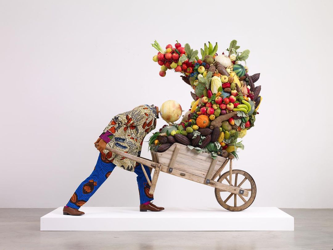 Shonibare, a self-proclaimed "postcolonial hybrid" of British-Nigerian heritage is best known for his playful combination of colourful Dutch wax-fabric patterns popular in West Africa with the fashion of upper-class Victorian culture. As this show reveals, Shonibare thinks globally and uses his artistic imagination to comment on colonialism, art history, environment, education, knowledge, food justice, and other subjects of universal concern.