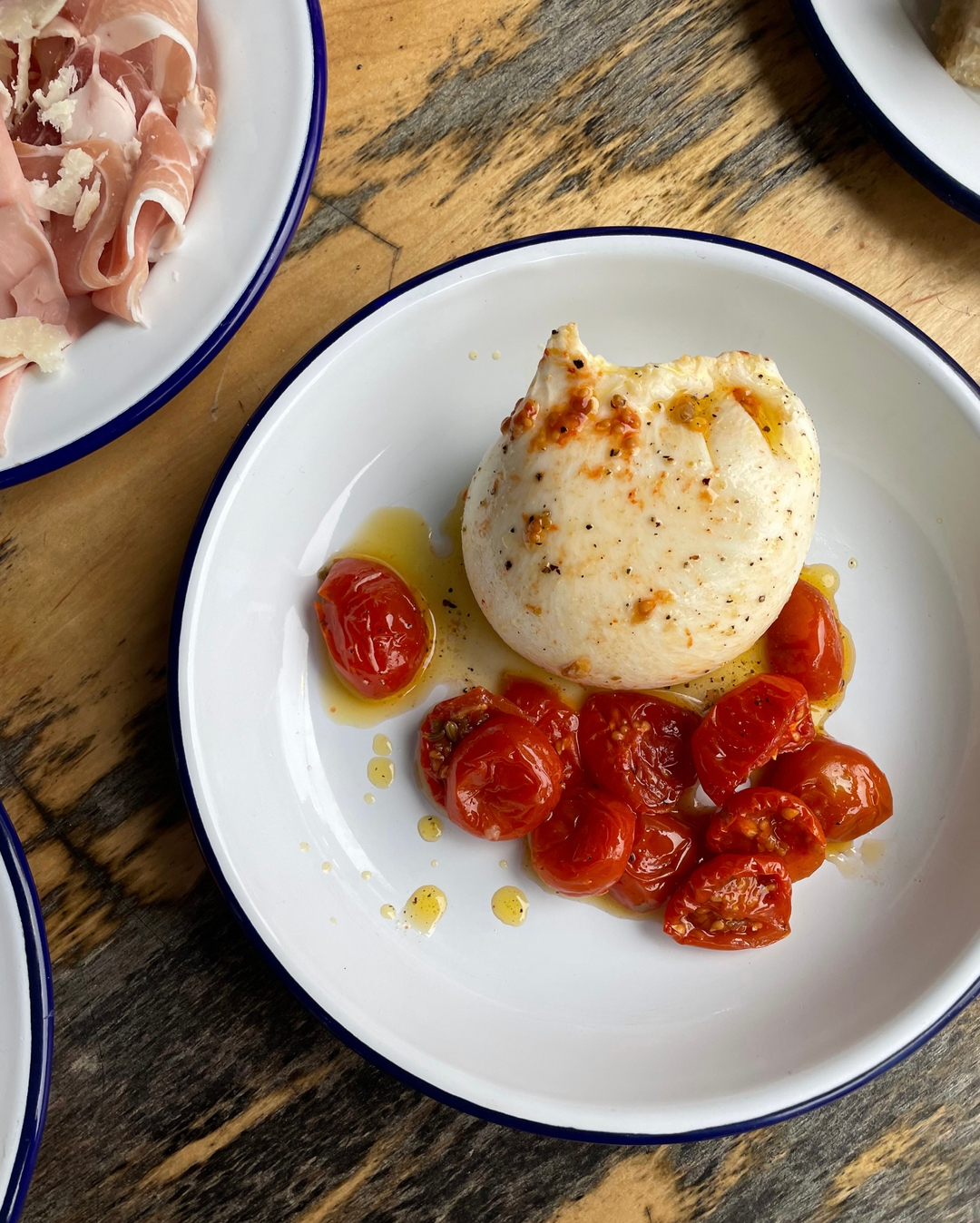 Simple things. Burratina + confit cherry toms, which are kind of like sun dried toms with a richer flavour but a bit more hydrated and juicy - oh so sweet.