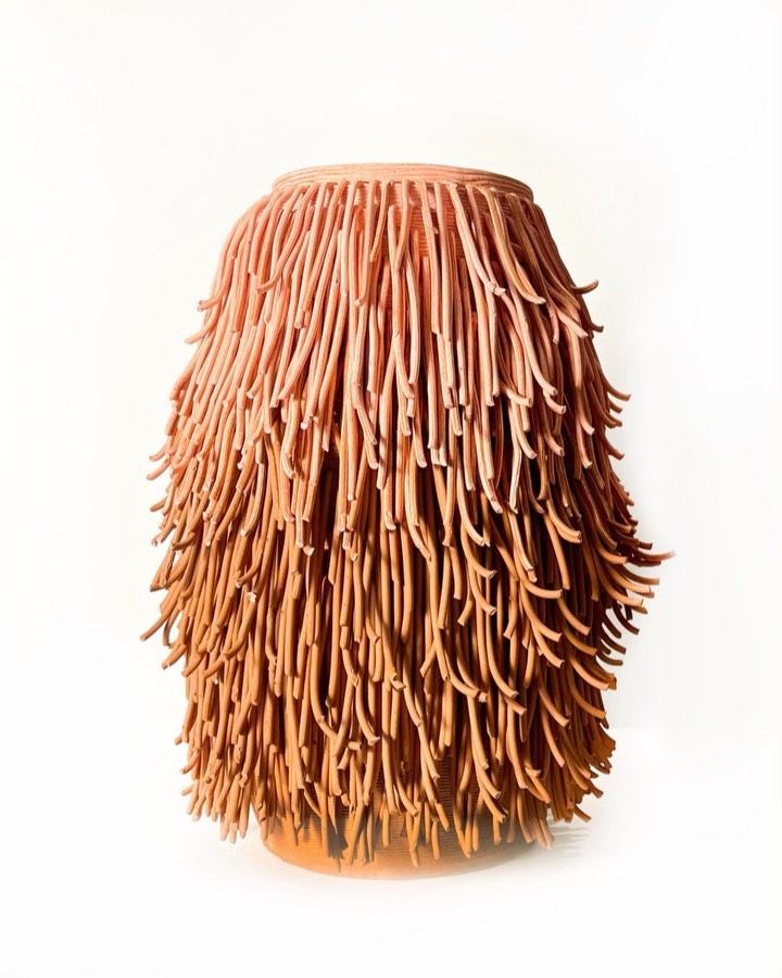 The robot 3D prints the digital design of the vase and the artist interacts with each piece by cutting the strands of clay into a shag and then blow drys them after they are printed to modify the outcome. In this way, each beast is completely unique, designed by both robot and woman, working together.