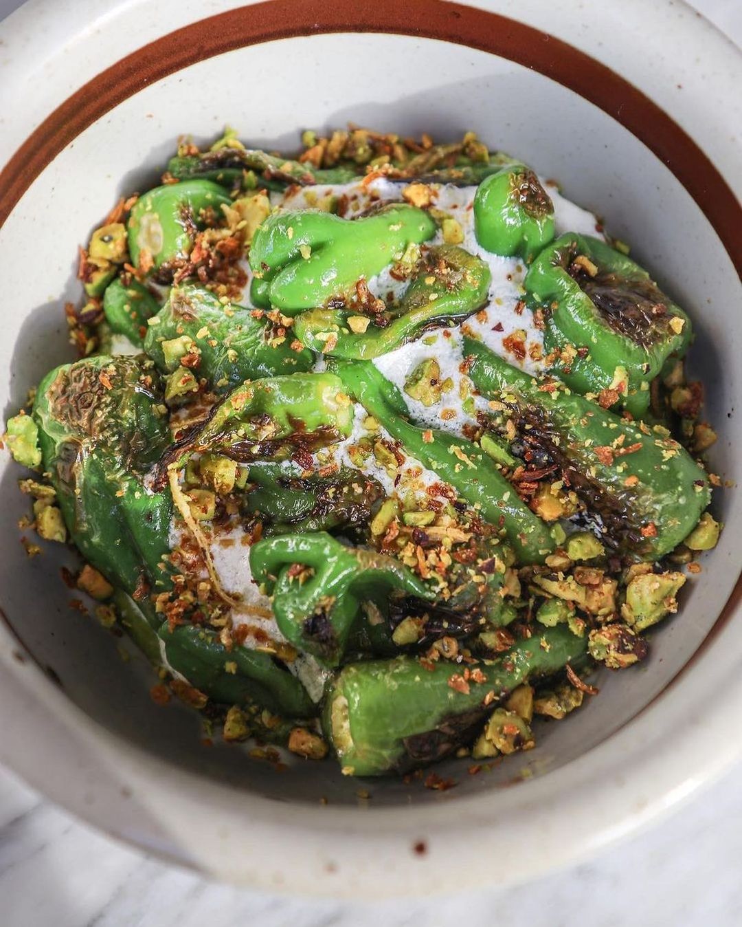 Padron peppers swimming in feta & mole verde. Excited to bring this dish to NYC and see what kind of peppers the @unsqgreenmarket has to offer.