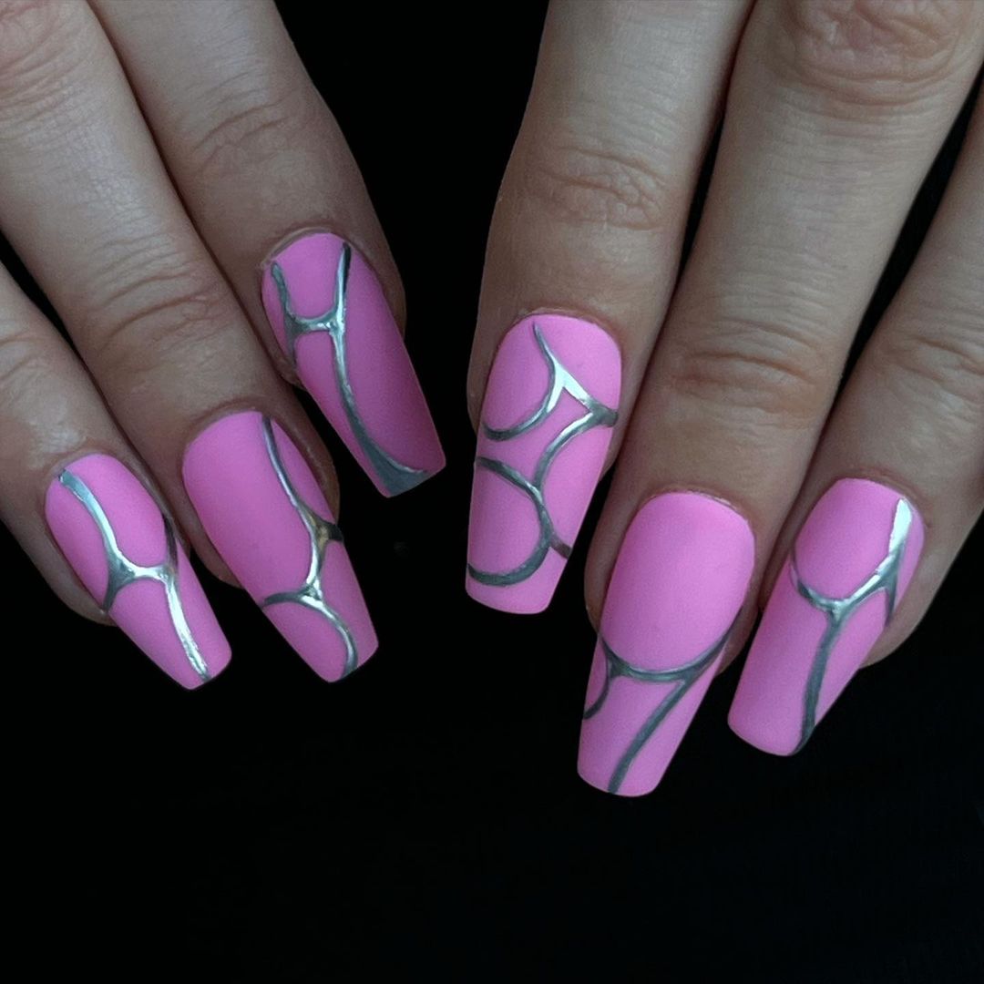 #lakwerk#amsterdam#chrome#chromenails#silver#metallic#pink#pinknails#nailextensions#apresnails#longnails#naildesign#handpainted#freehandnailart#summer#summernails#mattenails