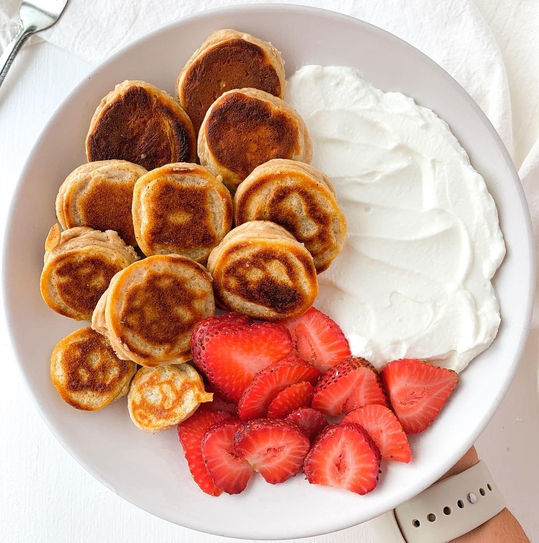 dEATS π Pancakes: banana slices dipped in pancake mix (I used @drinkorgain protein pancake mix) and then cooked on low/medium heat // paired with @chobani Greek yogurt & strawberries