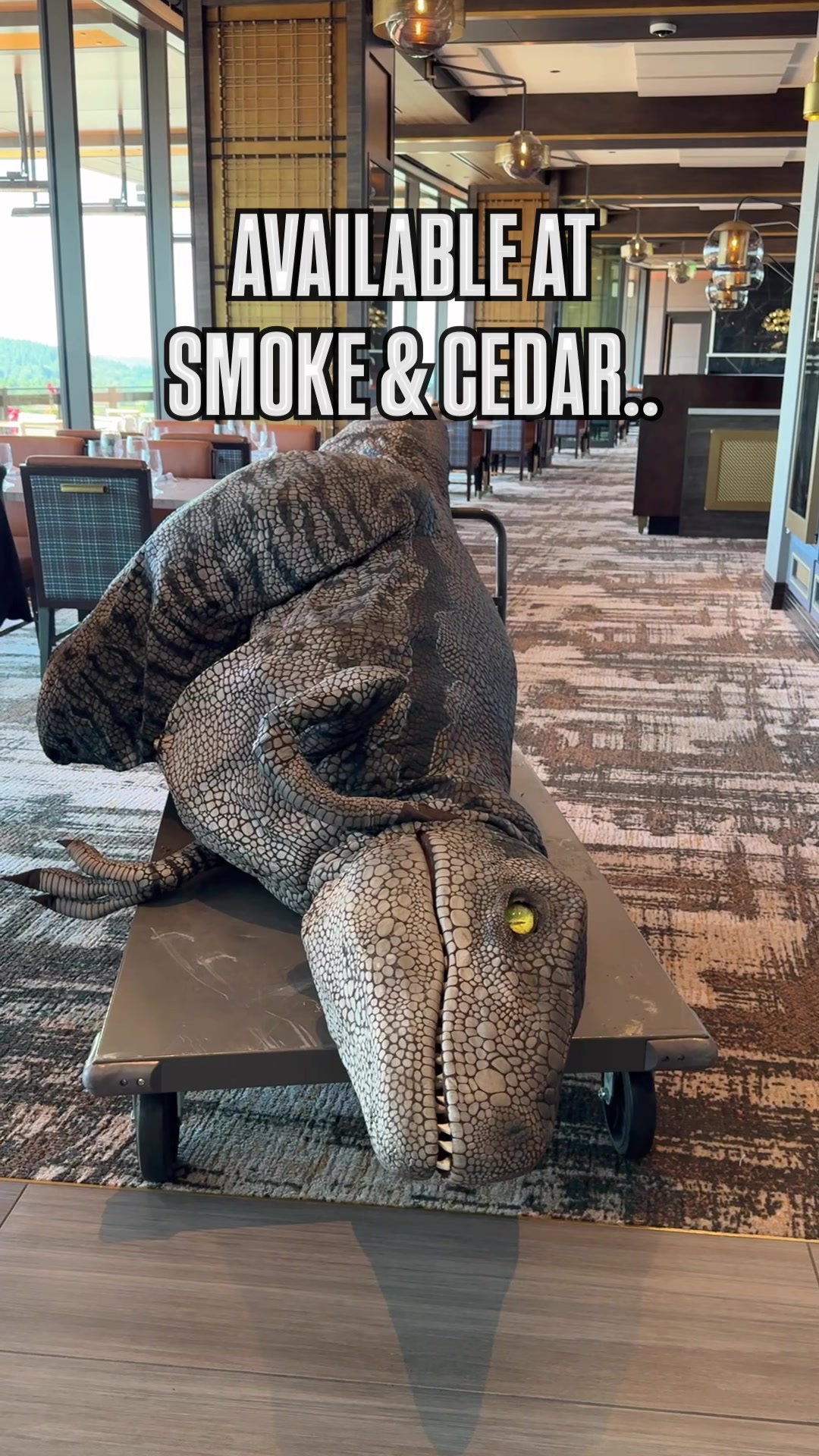 We found this guy roaming the halls of our resort tower. We serve him ....rare, medium rare or well done...🥩🦖 . . Just kidding, we do have signature dishes like the Hanging Bourbon Bacon 🥓 and a massive a 40oz Tomahawk Steak 🥩 you can order at Smoke & Cedar! Book your reservation for tonight and try it today! https://muckleshootcasino.com/dining/smokecedar - #smokeandcedar #steak #dinosaur #meat #yummo #foodies #goodeats #jokes #funny