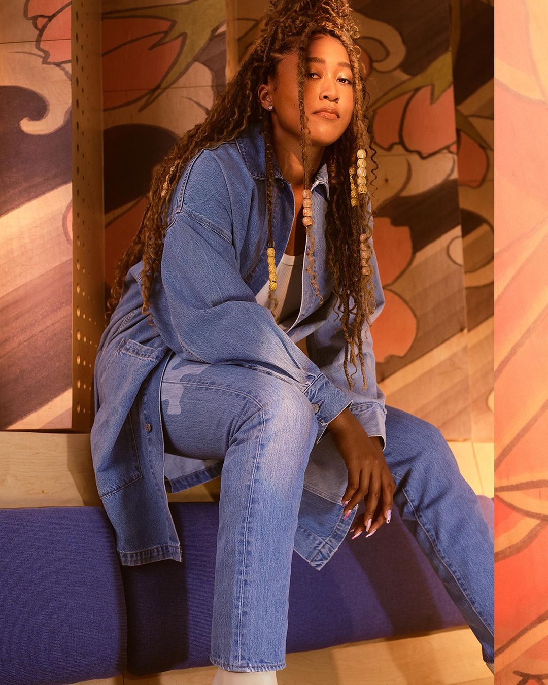 In our second collaboration with the athlete-changemaker-entrepreneur, Naomi brings exaggerated volume and flower-power attitude to the latest collection. Available now on the Levi’s® App, the collaboration features 3 unique tops & a skirt made with 100% organically grown cotton, plus a loose fit jean inspired by a 501®. She sketched the looks herself and together we brought them to life in a mix of denim washes and flower-bear prints.