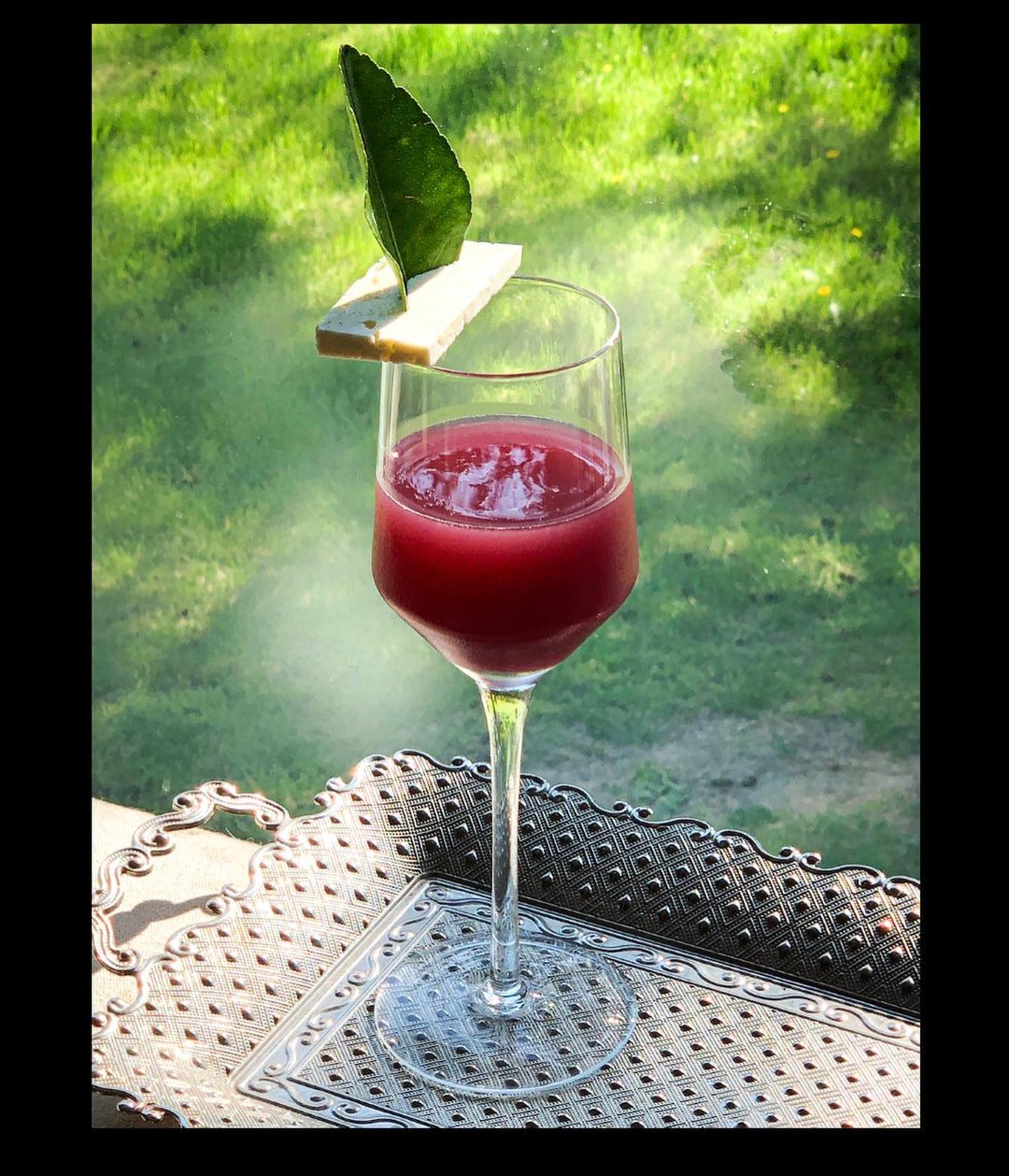 0.5 oz Reduction de Vermouth Sec dans les cerises noires et feuille de lime makrut